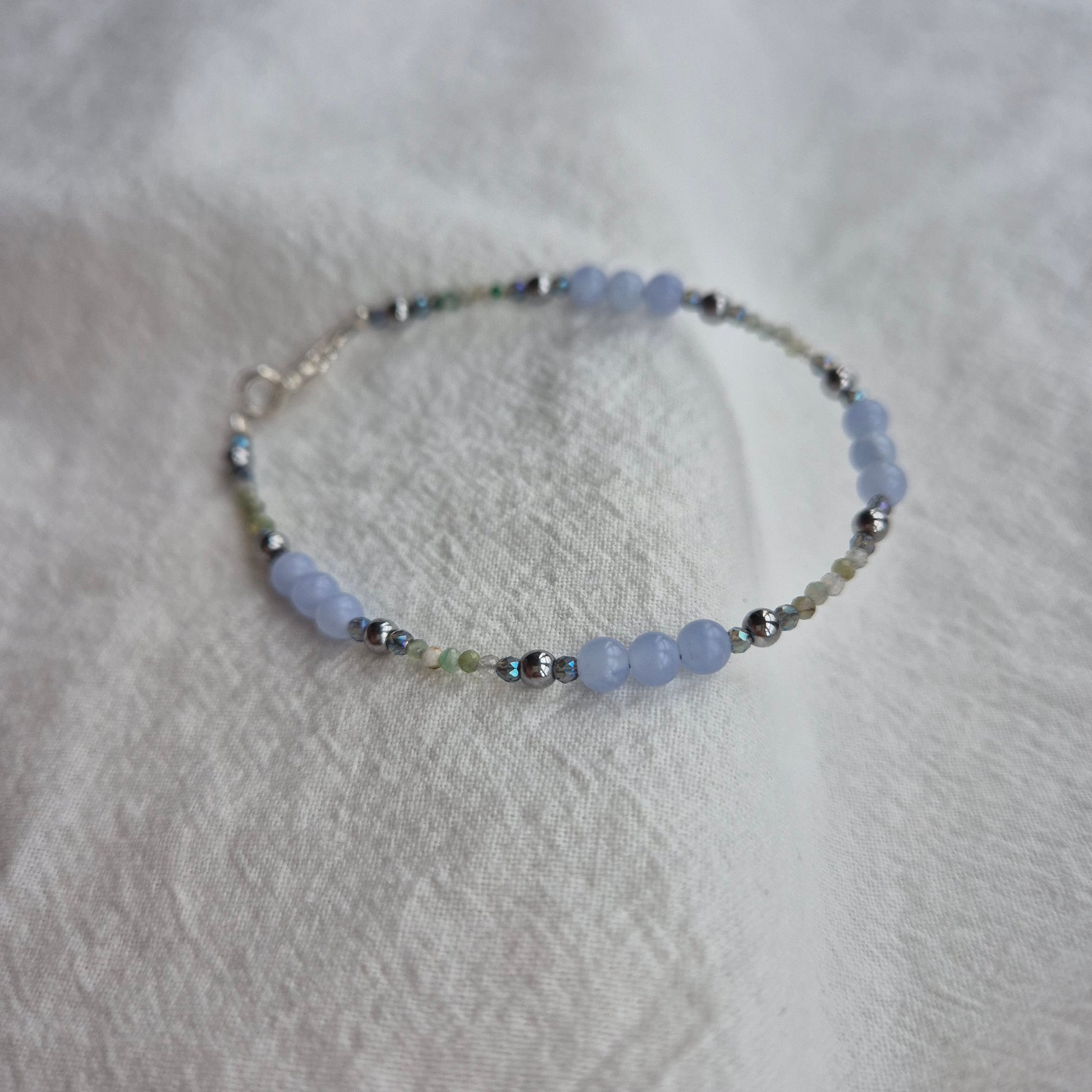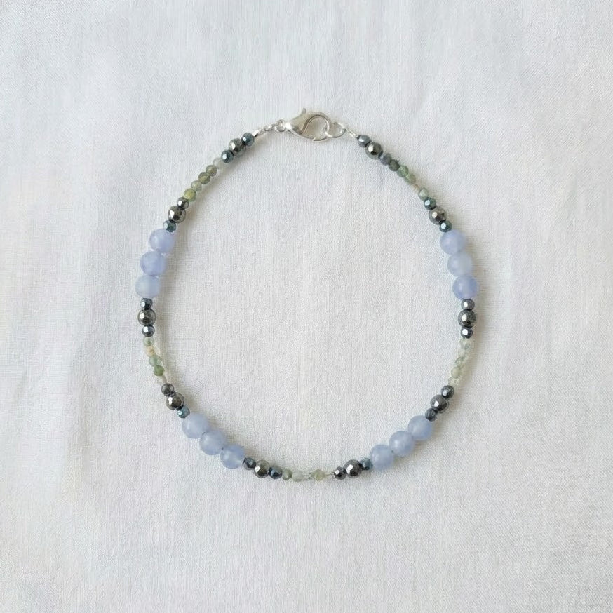To bransoletka dla Królowej Śniegu. Cyrkonia i fluoryt mienią się jak płatki śniegu pomiędzy agatami pasiastymi w odcieniu chłodnego błękitu