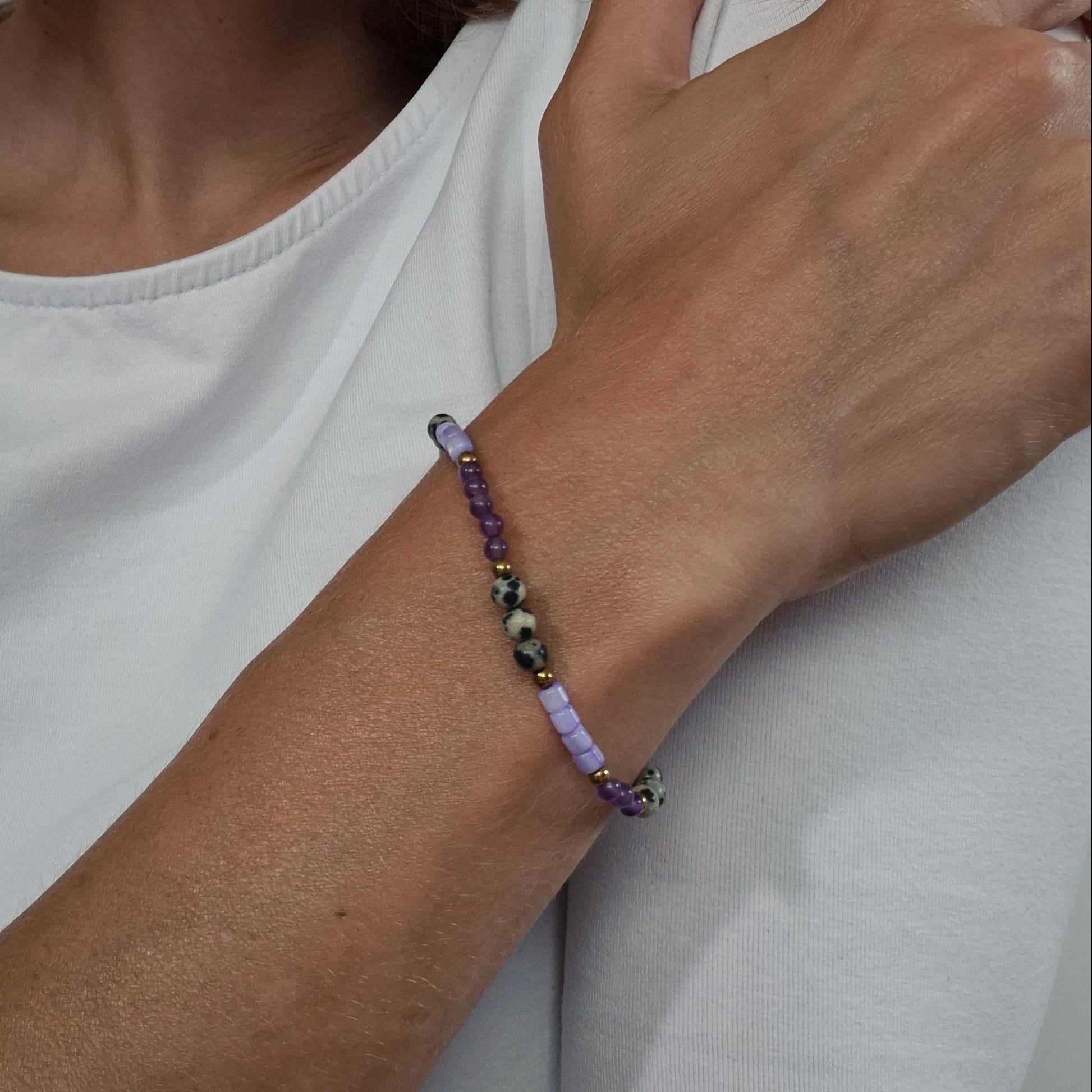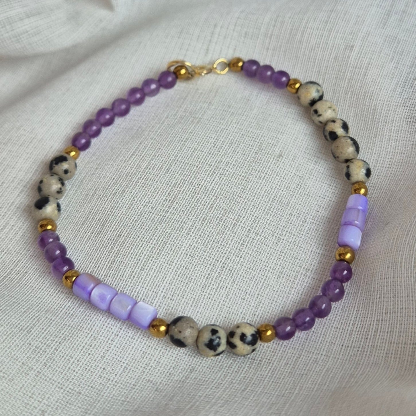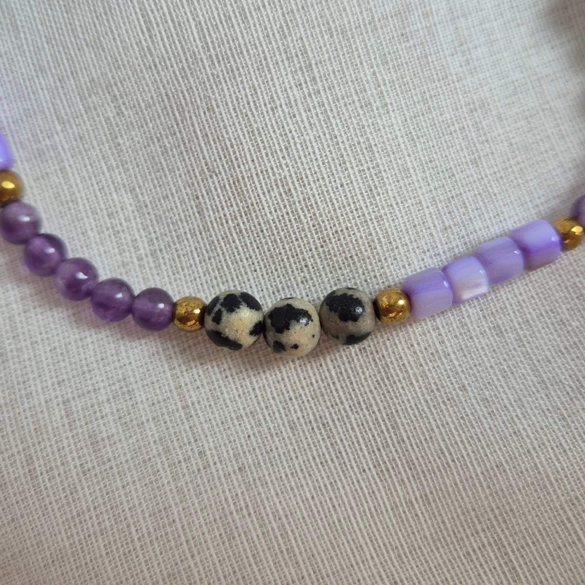 Jaspis dalmatyński "lubi się" z intensywnymi, równoważącymi go kolorami. Tutaj w wersji fioletowej na kilka sposobów: transparentny jadeit i pastelowa masa perłowa.
