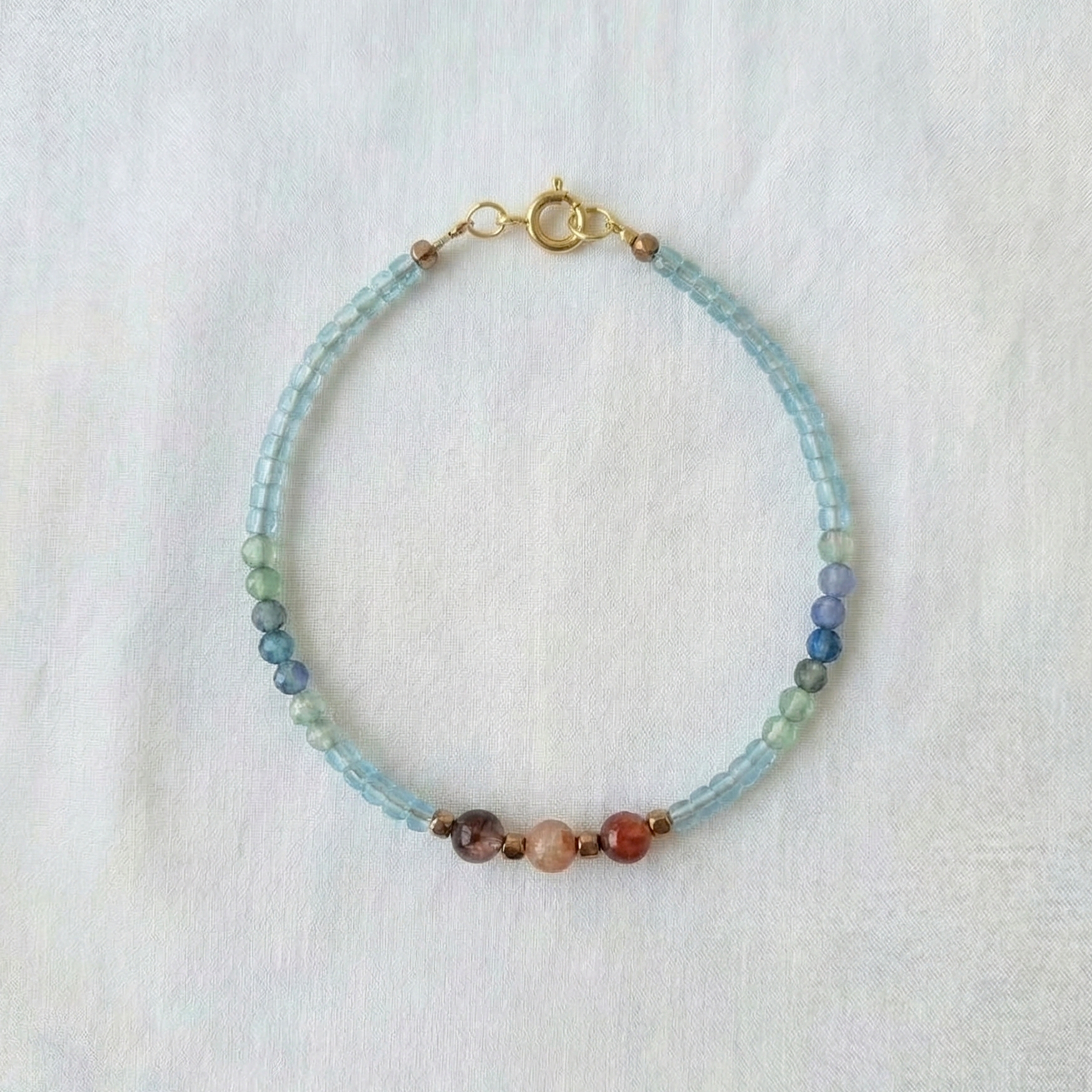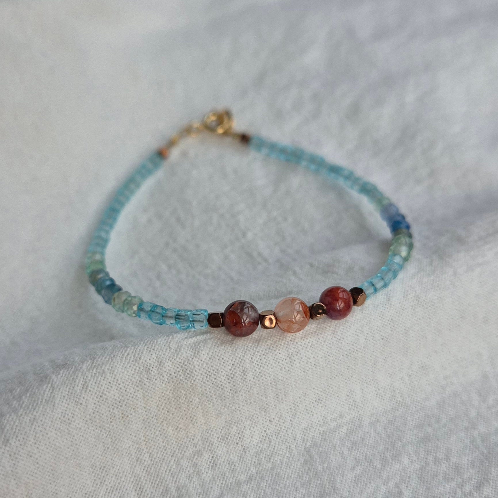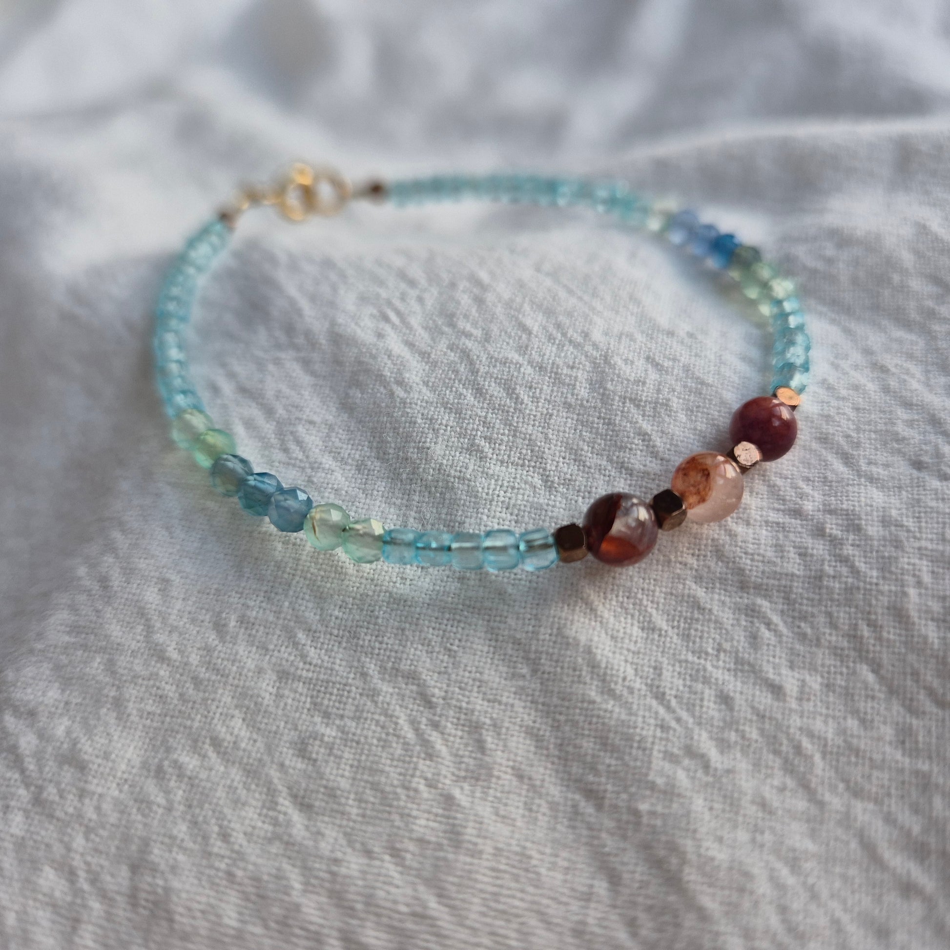 Połączenie wodnego błękitu z ziemistym brązem, sześcianów z okrągłymi koralikami, fasetu z gładką powierzchnią. Kontrasty sprawiają, że lepidolit z topazem tak pięknie się uzupełniają.