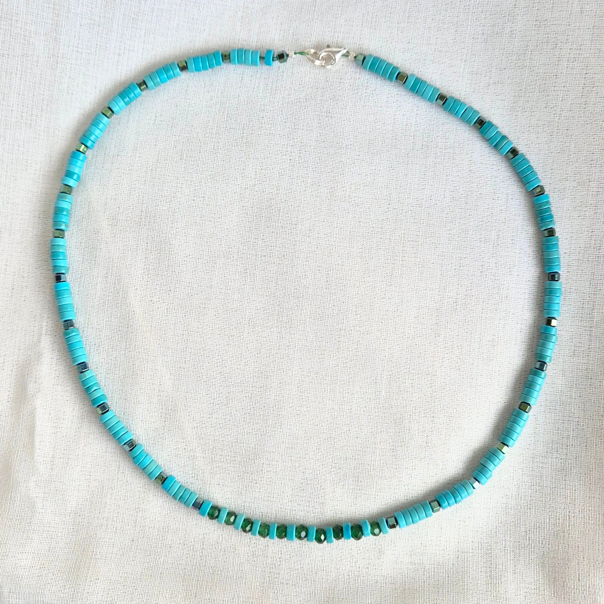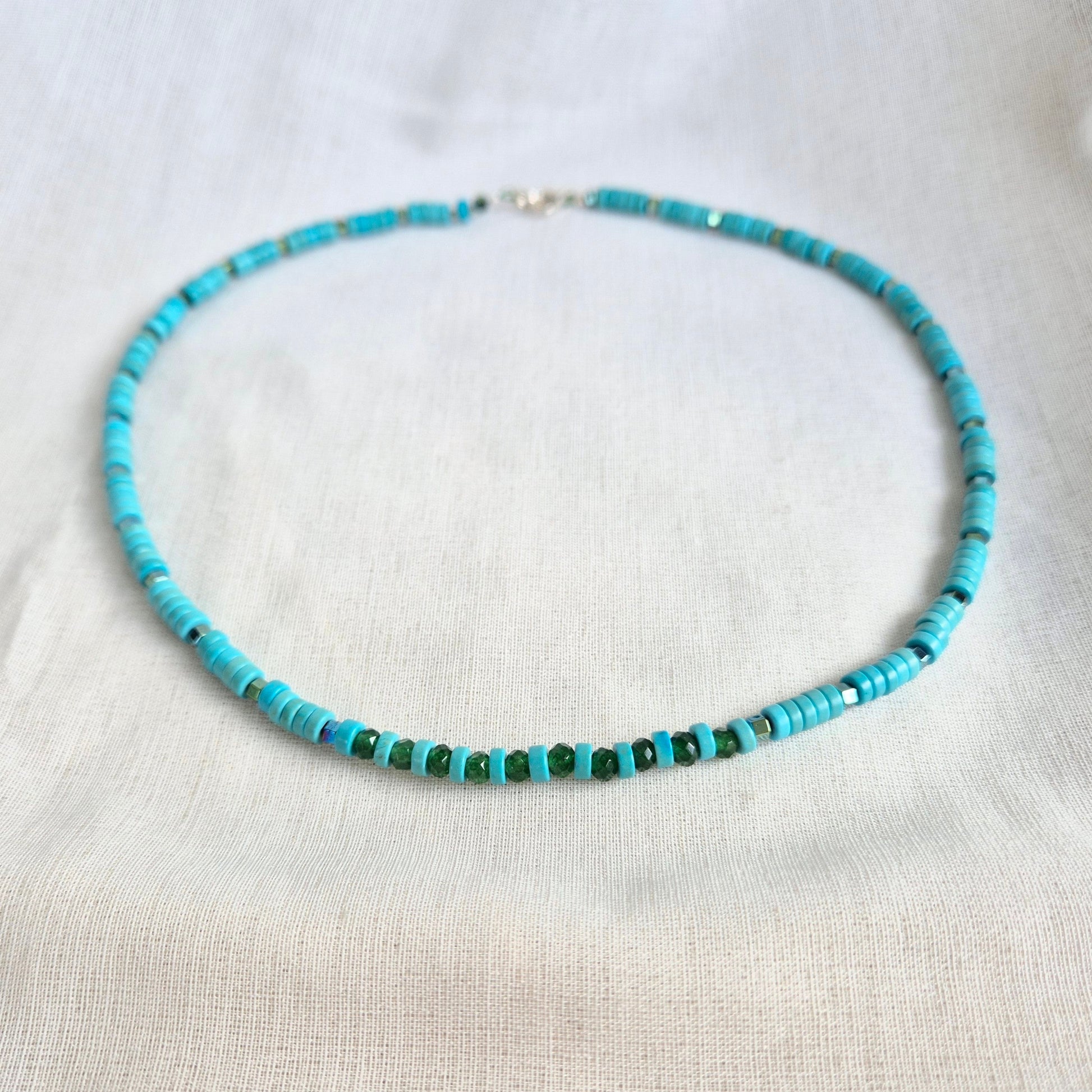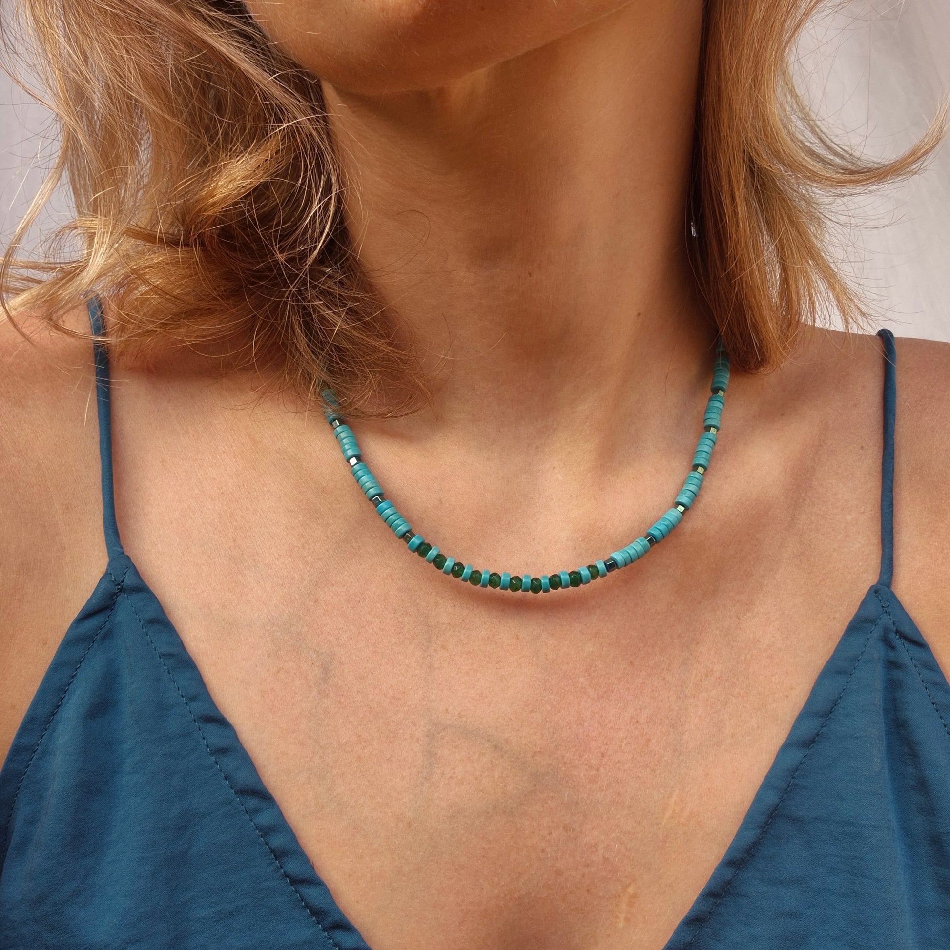 Morskie głębiny na szyi. Intensywny turkus magnezytu zestawiłam z zielenią jadeitu i odbijającego światło hematytu i zielonkawym wybarwieniu.