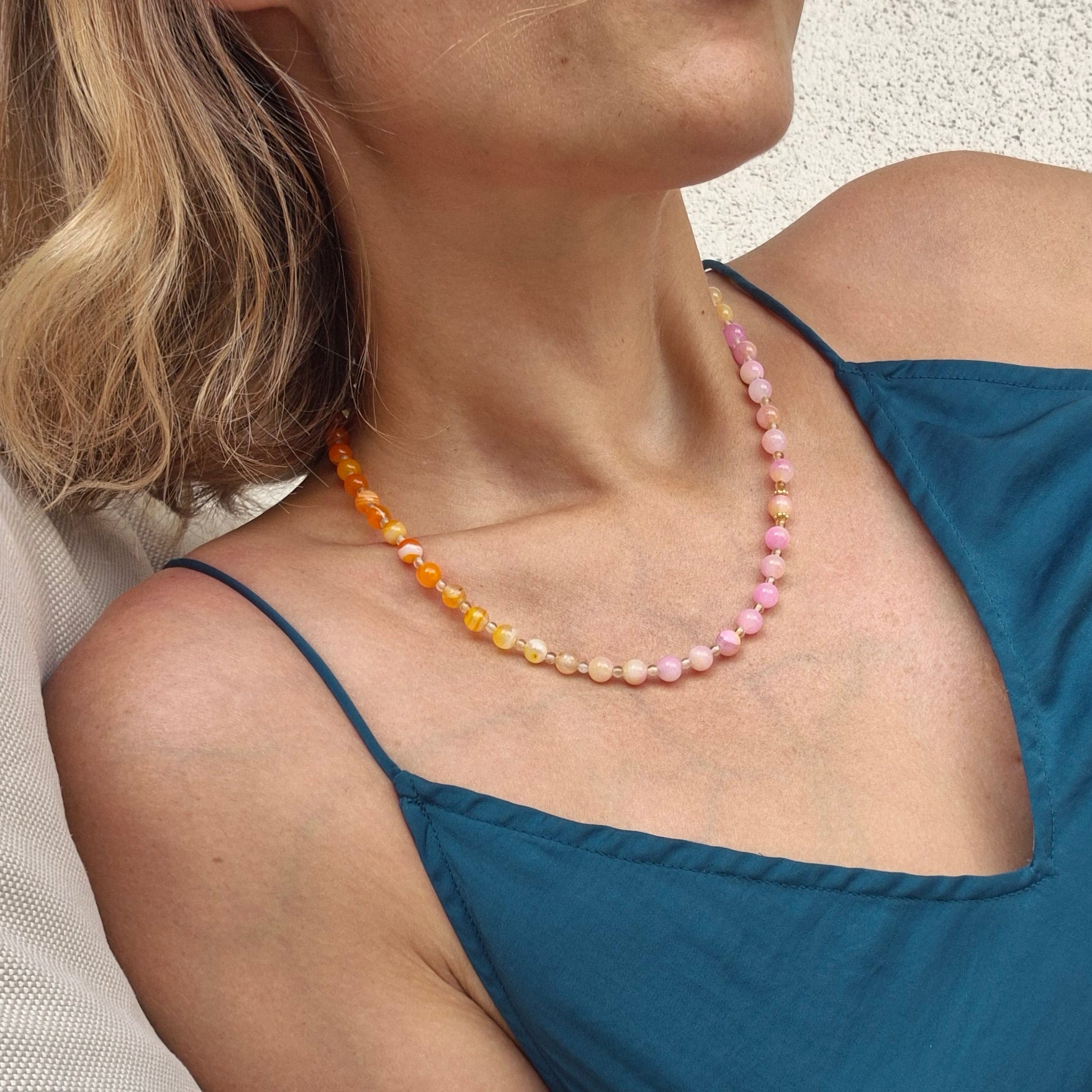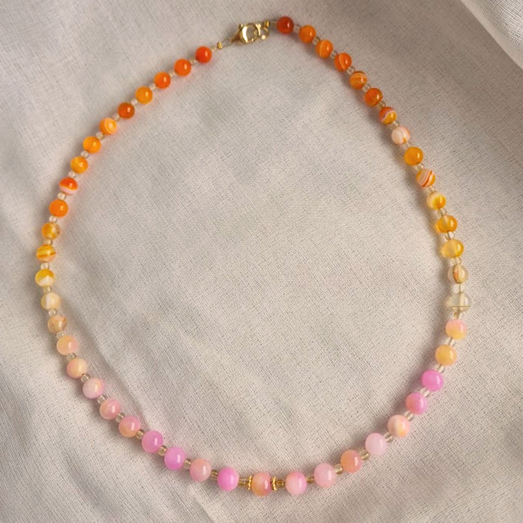 Pudrowy jadeit połączyłam z agatem pasiastym w intensywnym kolorze. Poprzetykałam je soczystym cytrynem. To jak połączenie lodów truskawkowych z sorbetem pomarańczowym. Zwróć uwagę na cieniowanie między kamieniami.