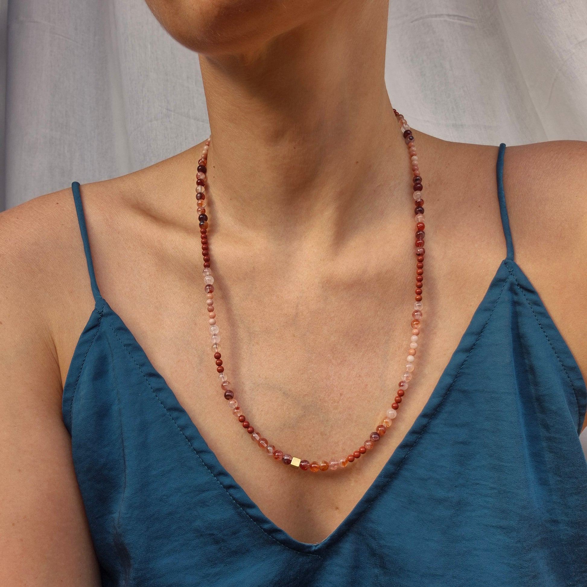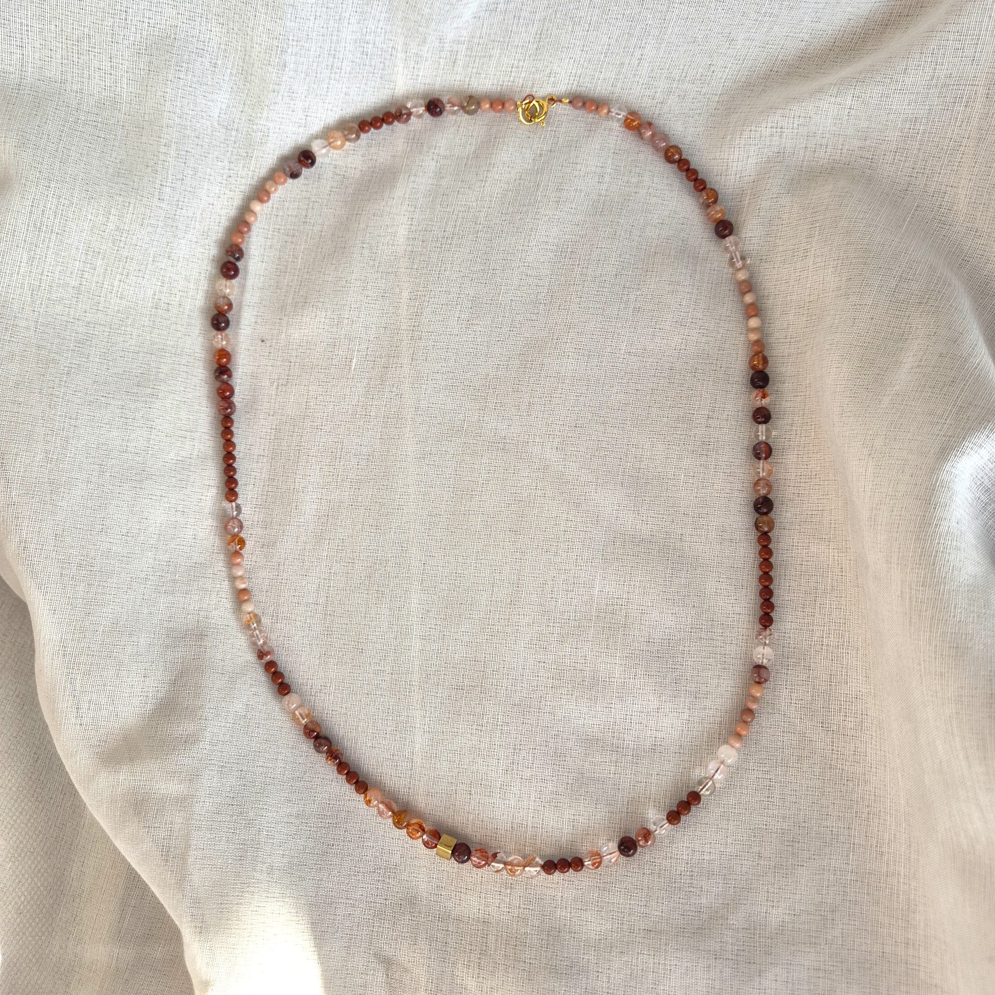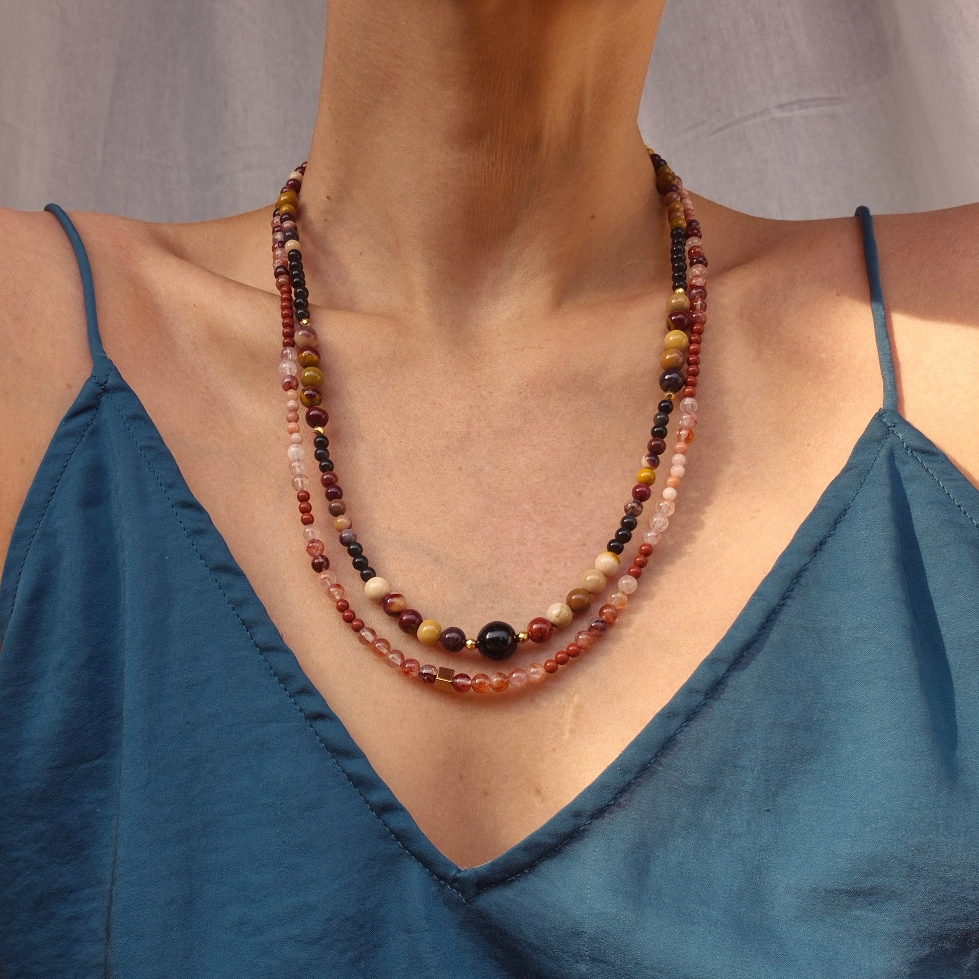 Ten ciepły brąz to będzie hit jesieni! Dojrzała brzoskwinia awenturynu połączona z głęboką ciepłą czerwienią jaspisu i transparentnego lepidolitu, który bajecznie przepuszcza ostatnie promienie słońca.