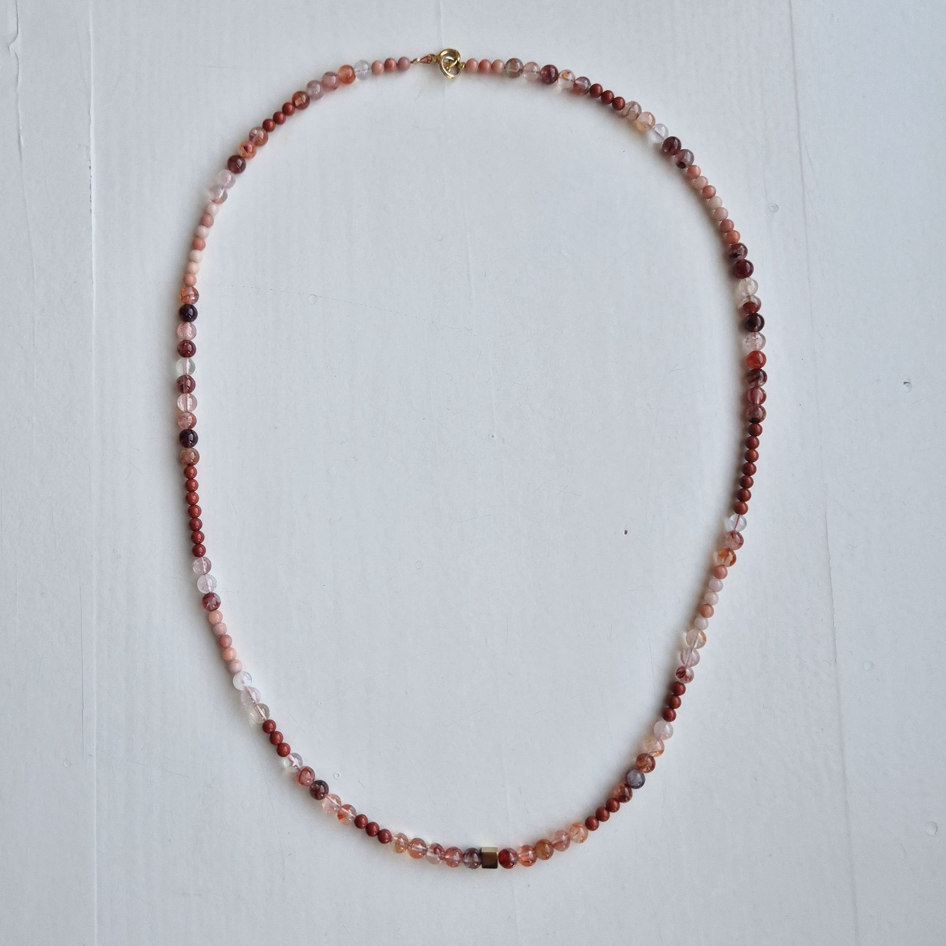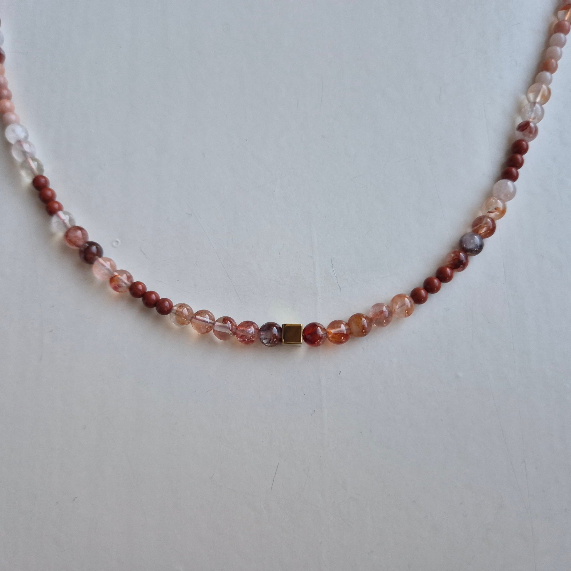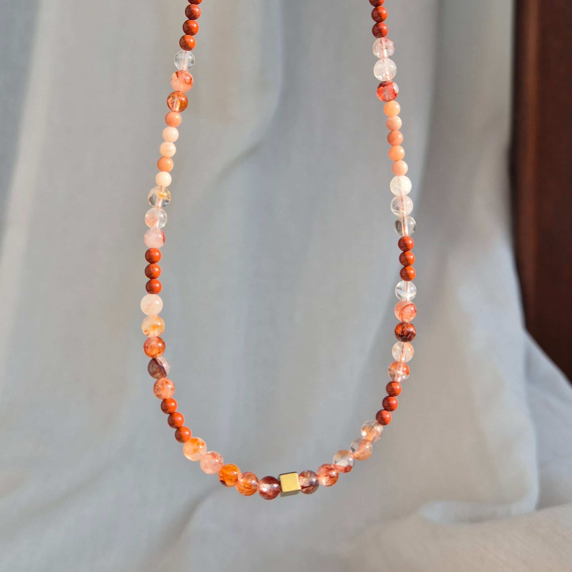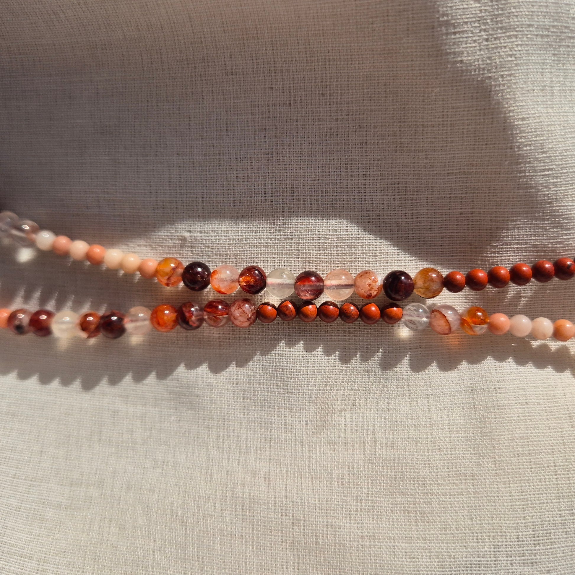 Ten ciepły brąz to będzie hit jesieni! Dojrzała brzoskwinia awenturynu połączona z głęboką ciepłą czerwienią jaspisu i transparentnego lepidolitu, który bajecznie przepuszcza ostatnie promienie słońca.