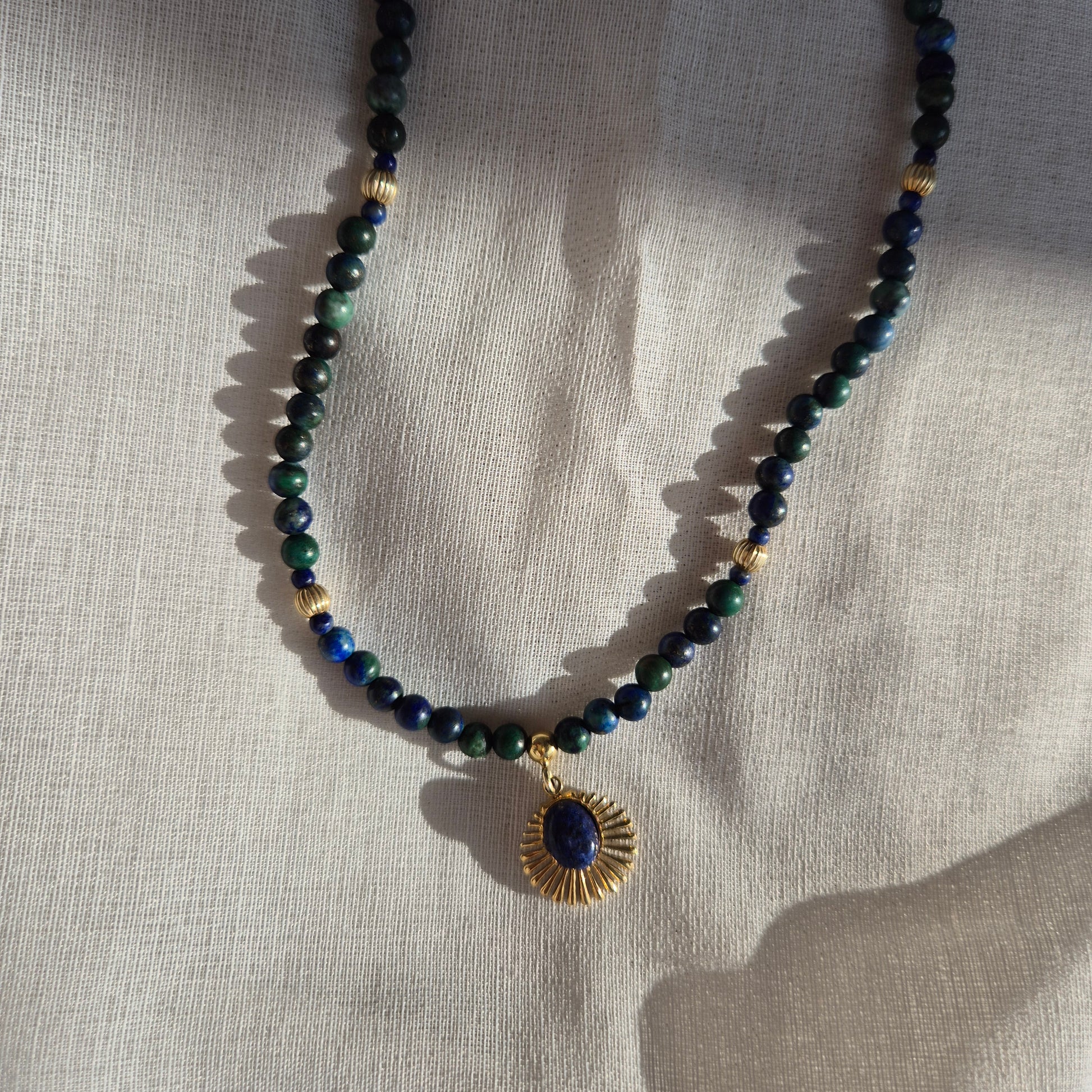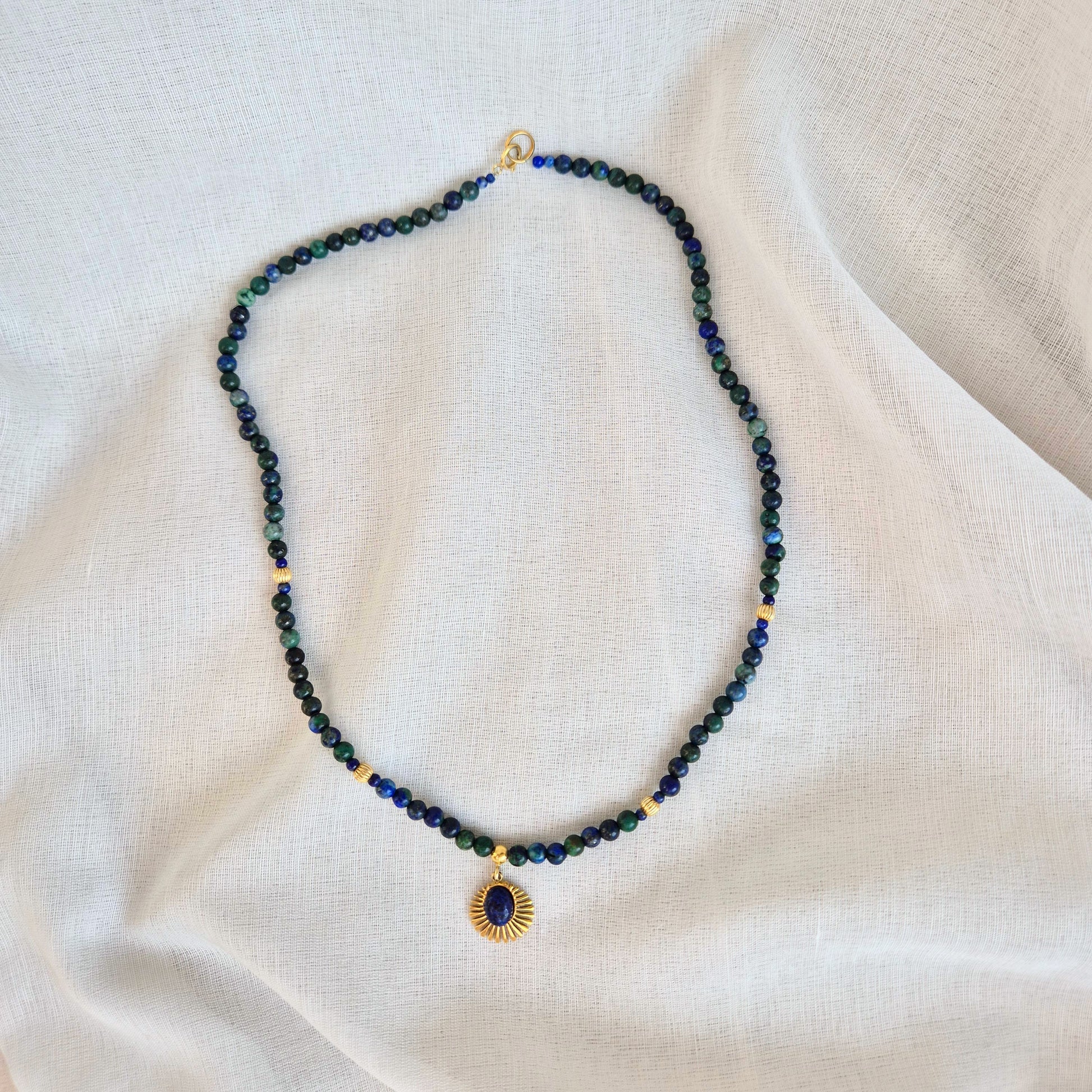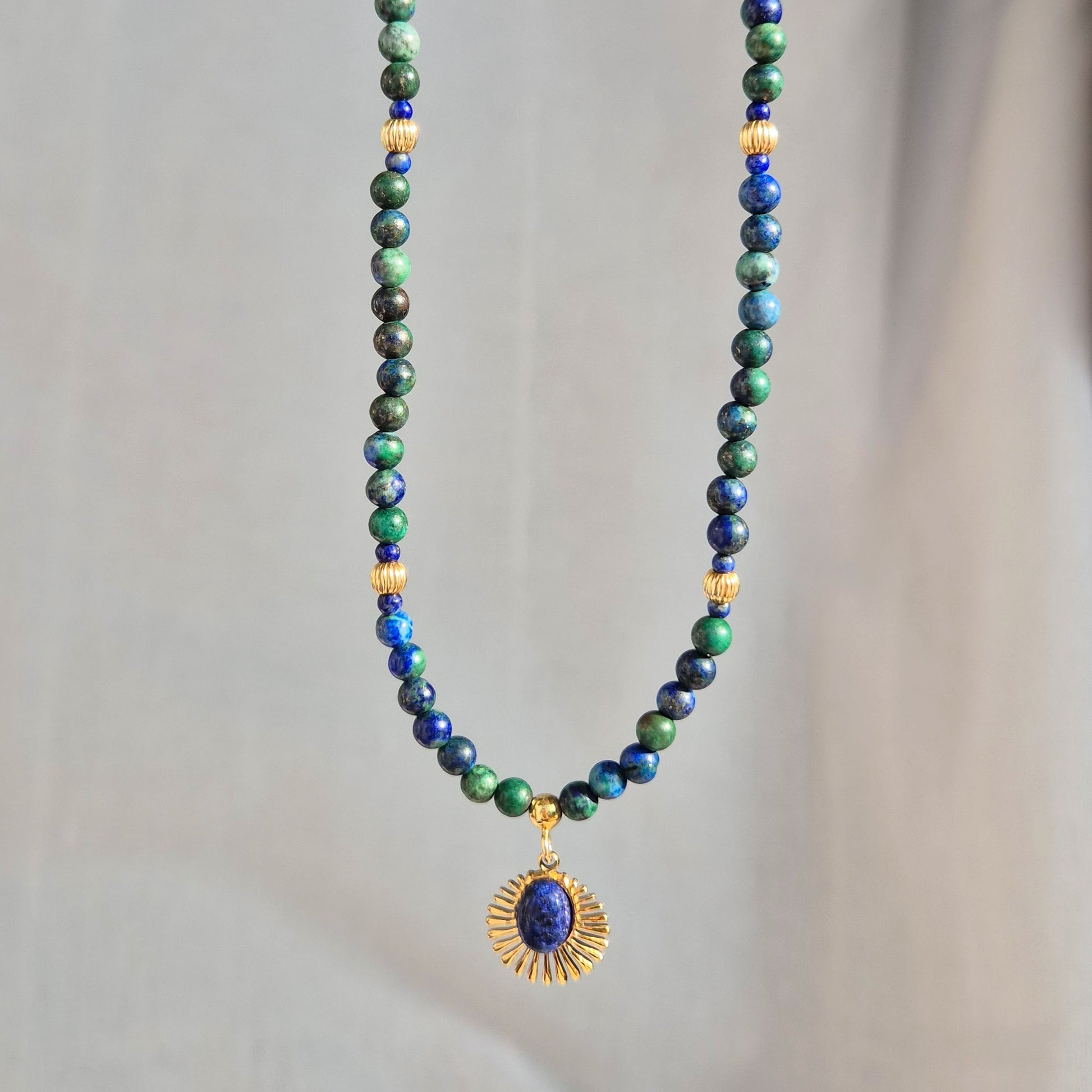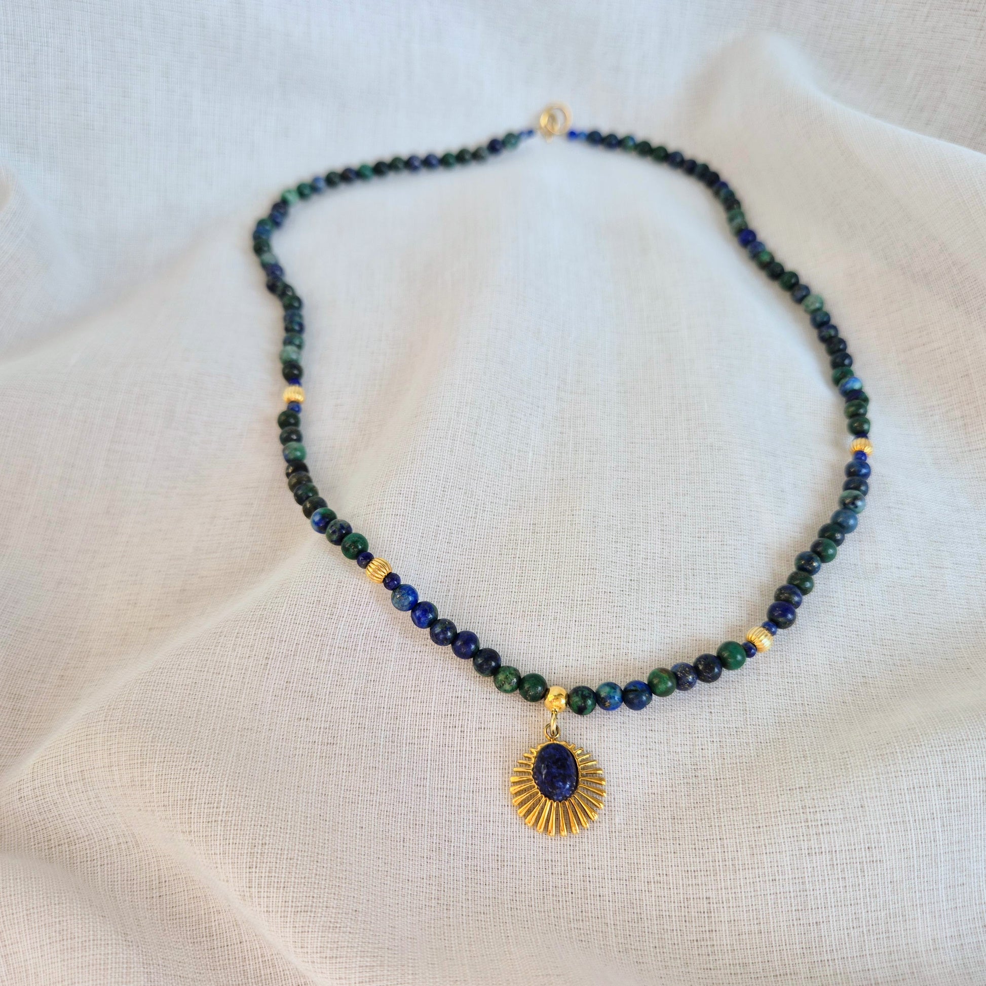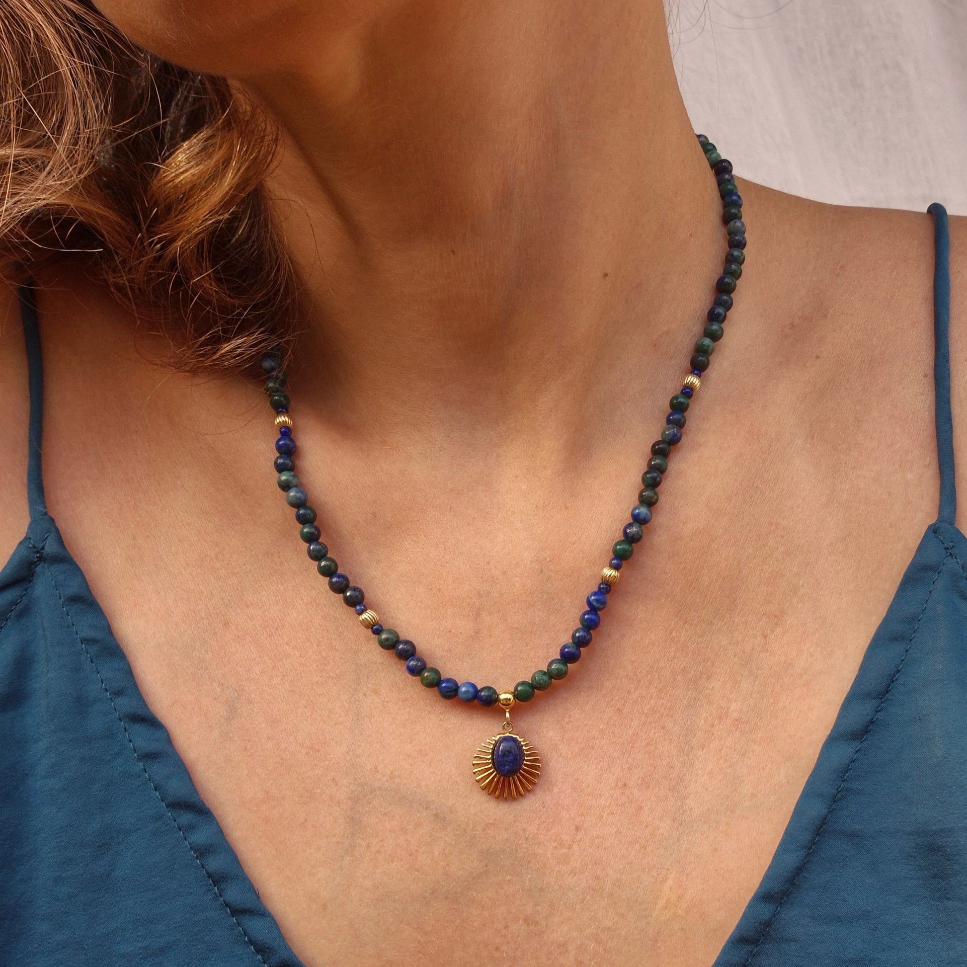 Klasyka w najlepszym wydaniu: lapis lazuli to kamień, który pasuje do koszuli i T-shirtu. Tu w podwójnym wydaniu: jako naszyjnik i wisiorek w zjawiskowej oprawie.
