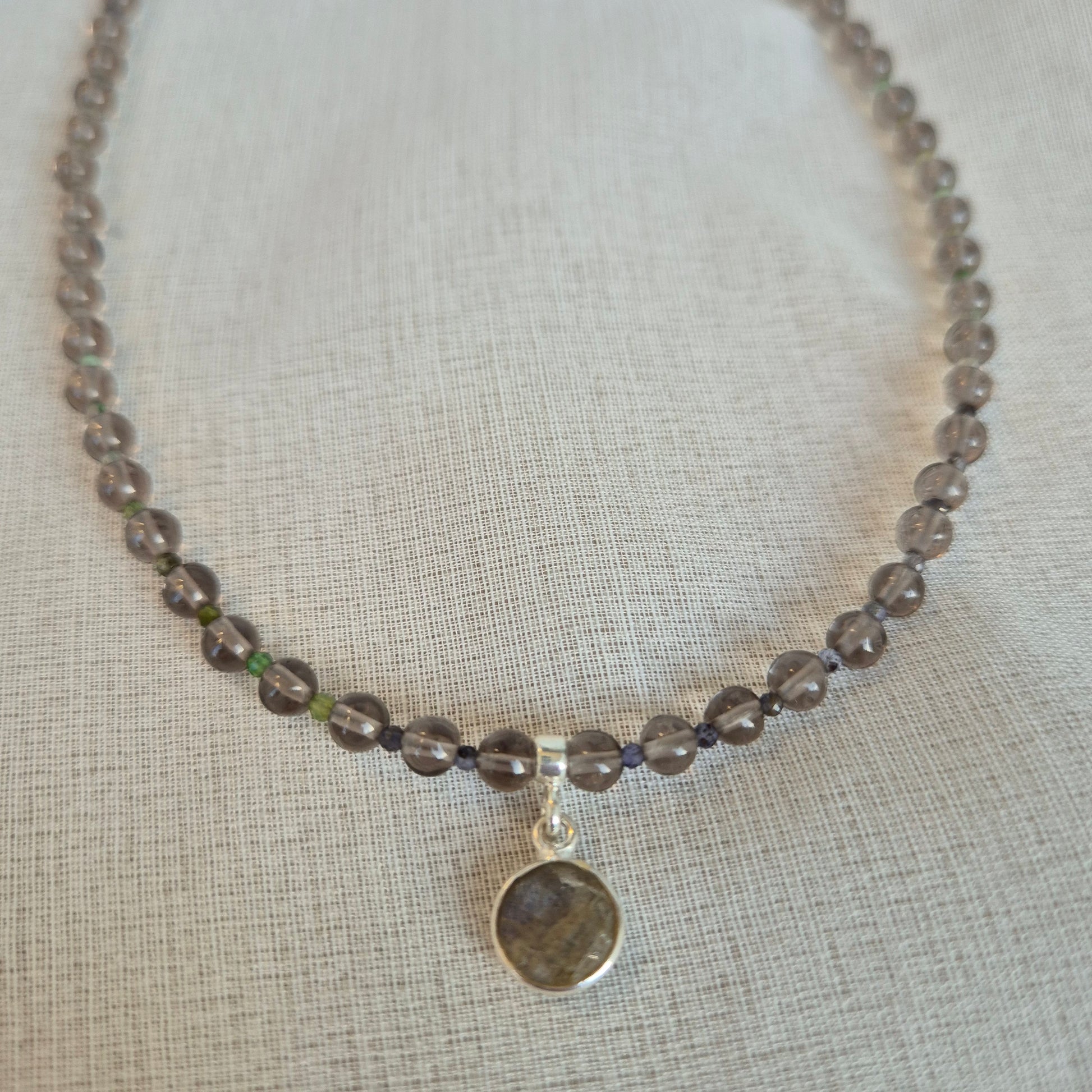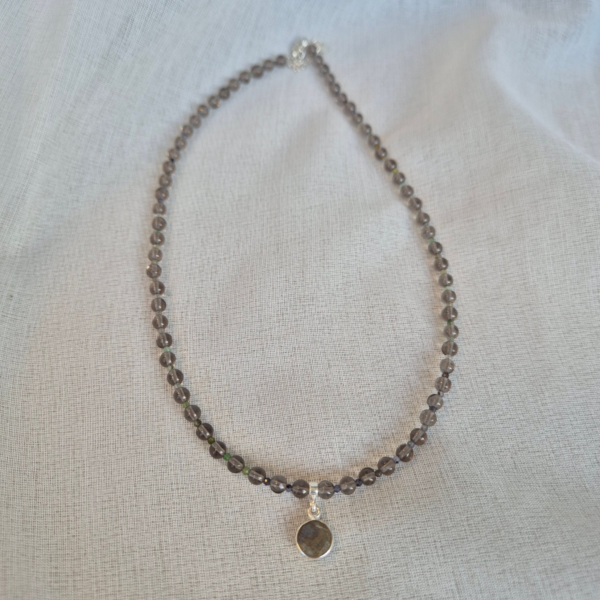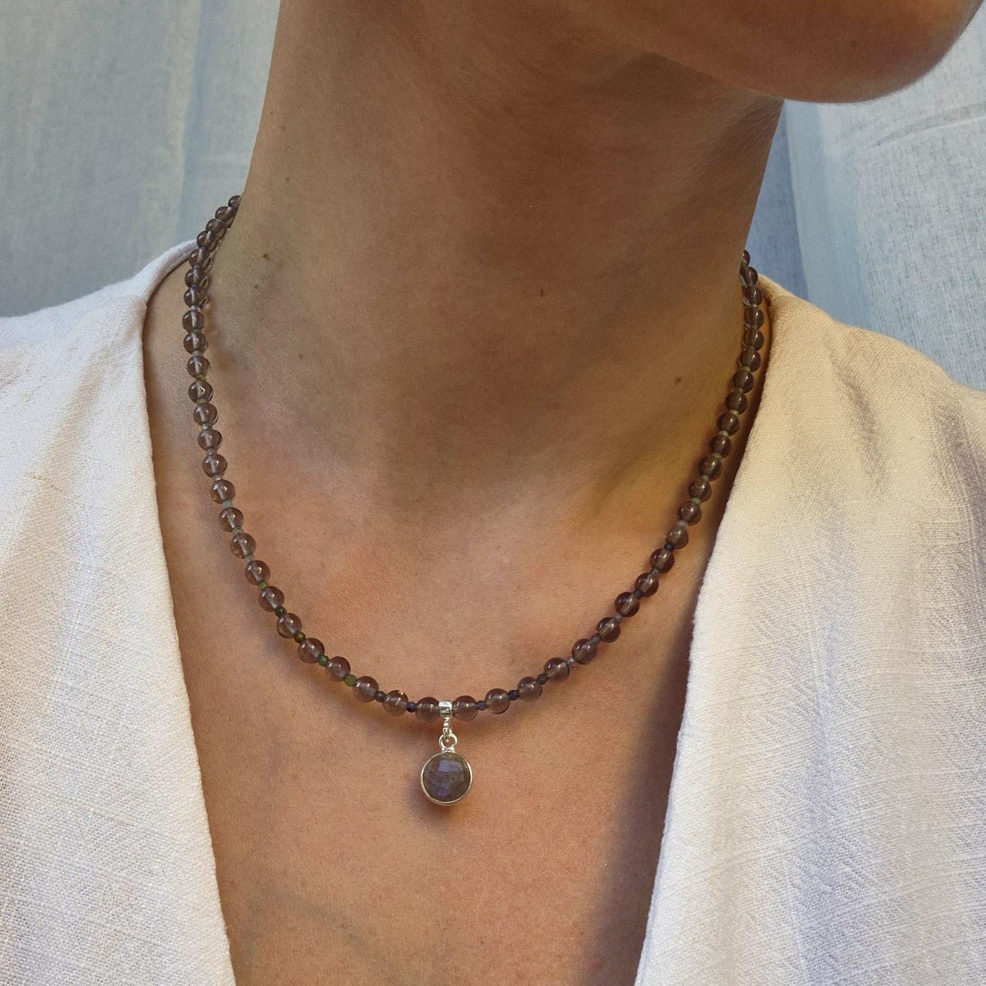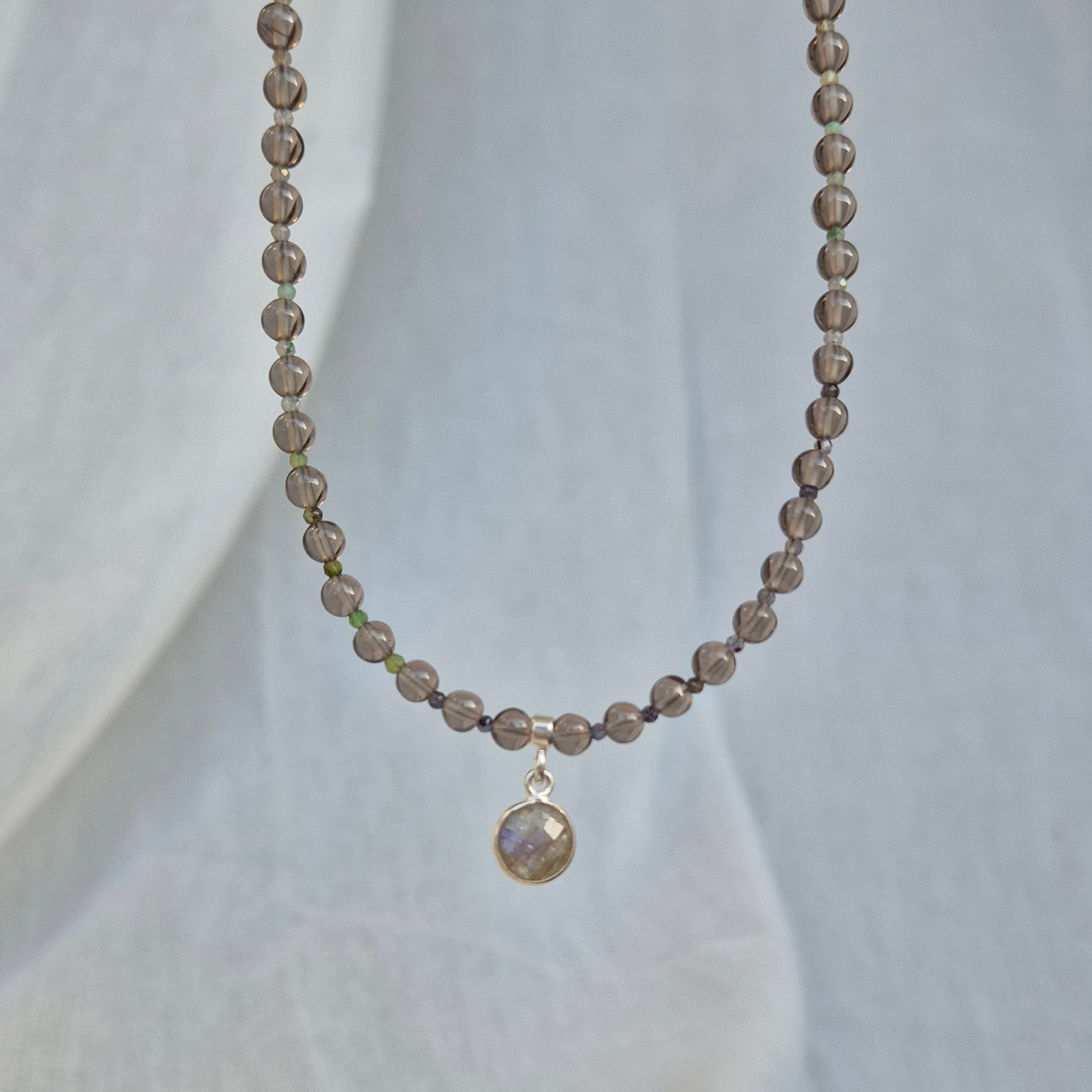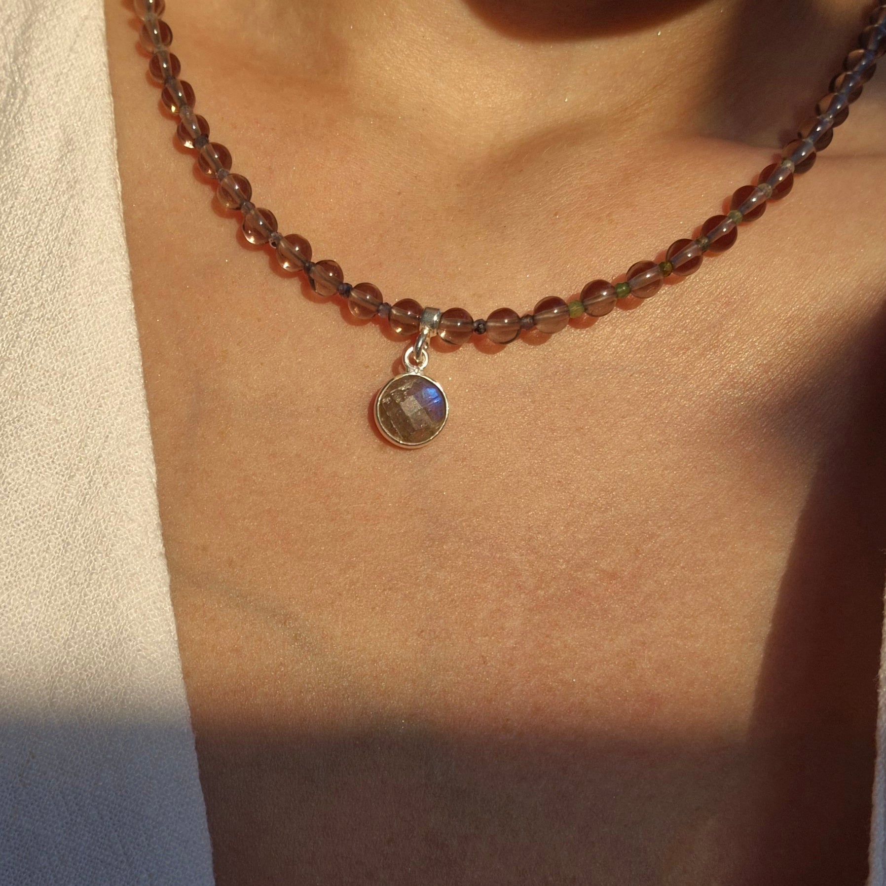Pokochałam kwarc dymny i labradoryt za nieoczywistość. Delikatnie szare na co dzień, nabierają magii pod wpływem słońca. Oddech kwarcowi dymnemu nadał fluoryt w pięknym zielono-niebieskim wybarwieniu.