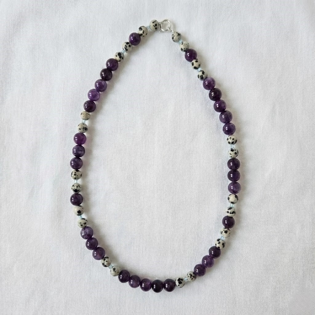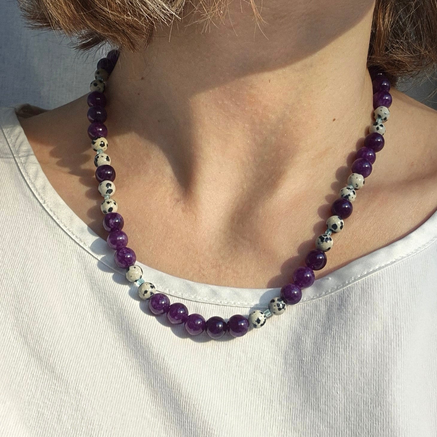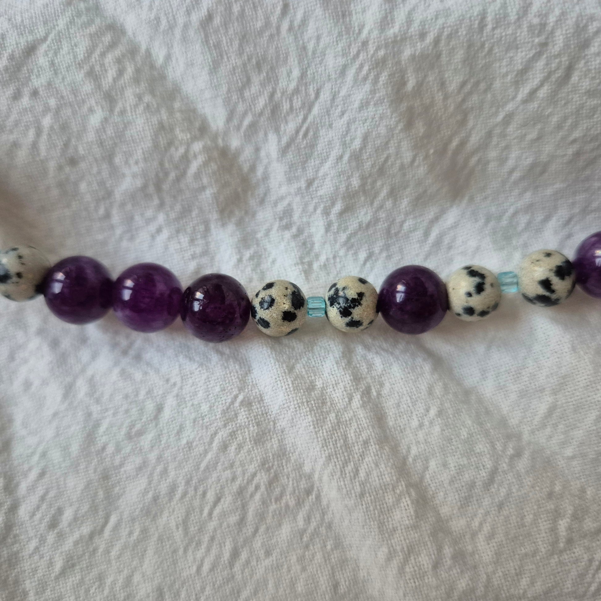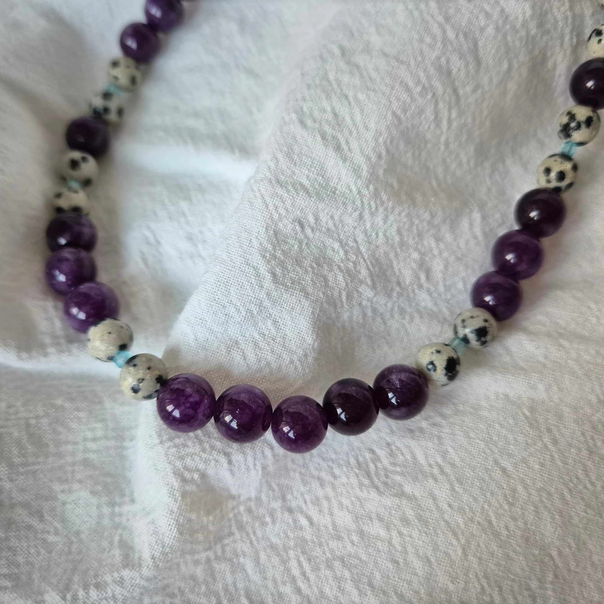 Ten naszyjnik jest idealny do jesienno - zimowych swetrów. Połączenie nasyconego ametystu, kontrastującego jaspisu z lazurowym topazem, który daje przyjemny oddech masywnym koralom.