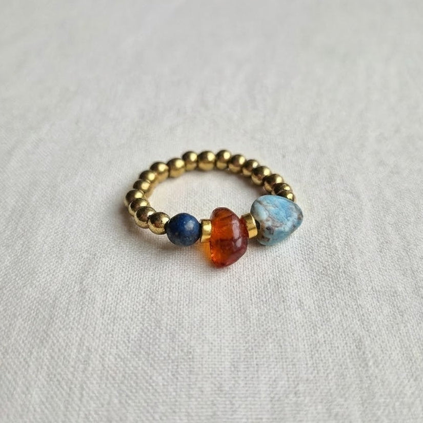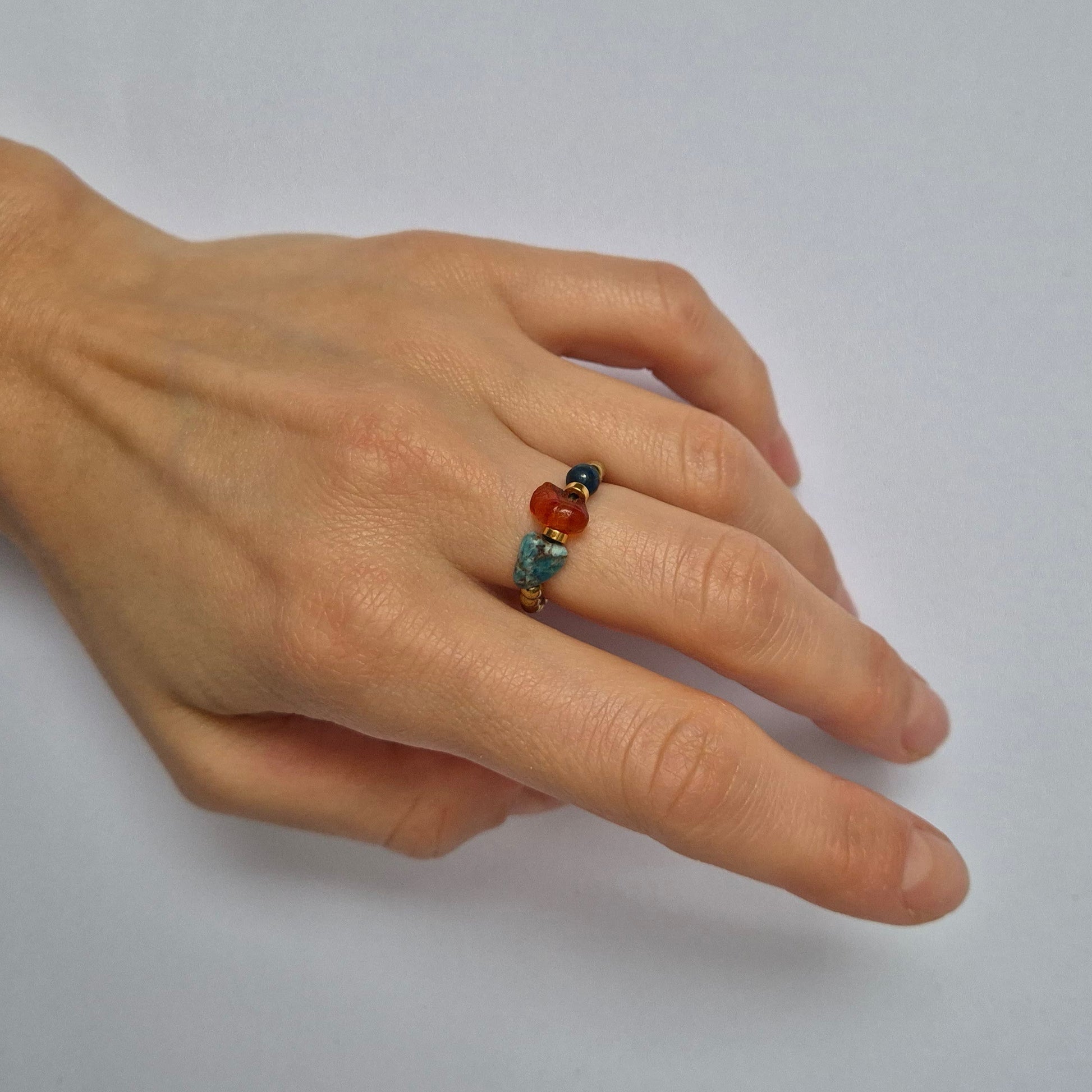 Pierścionek jest skonstruowany na gumce jubilerskiej, dzięki temu dostosowuje się do rozmiaru i kształtu palca.