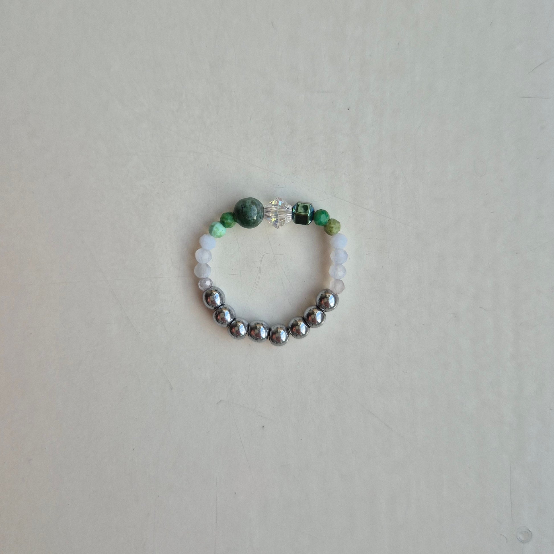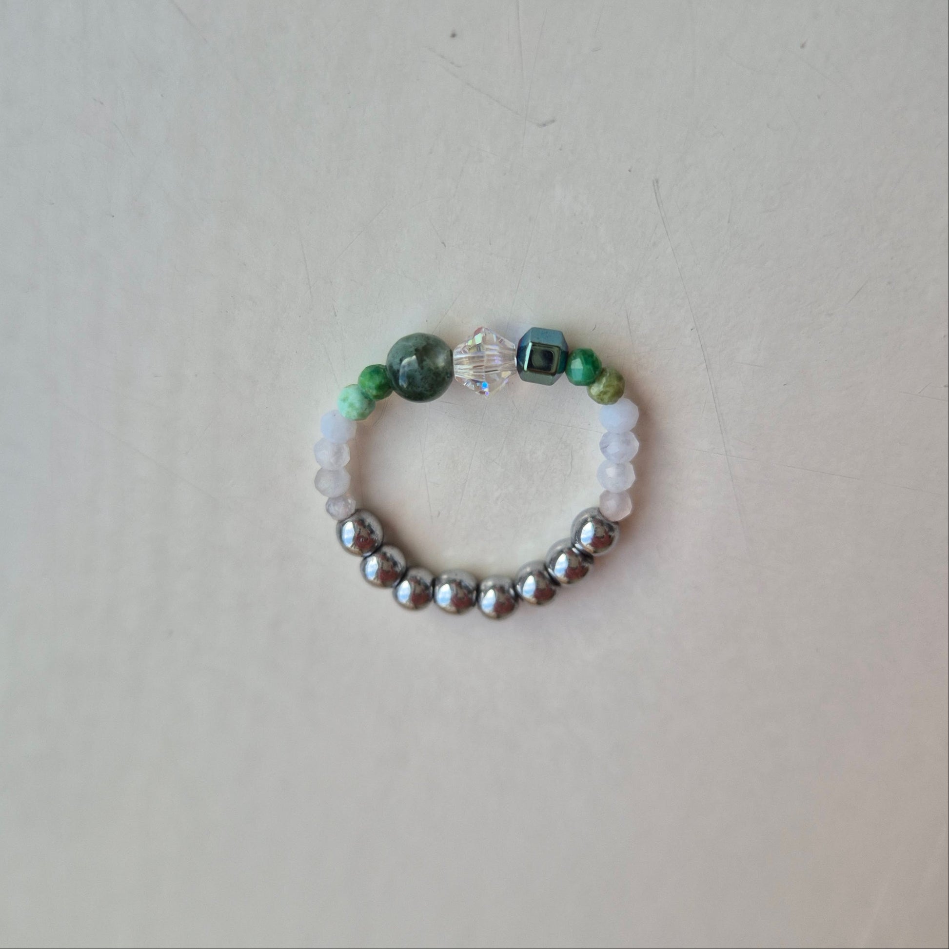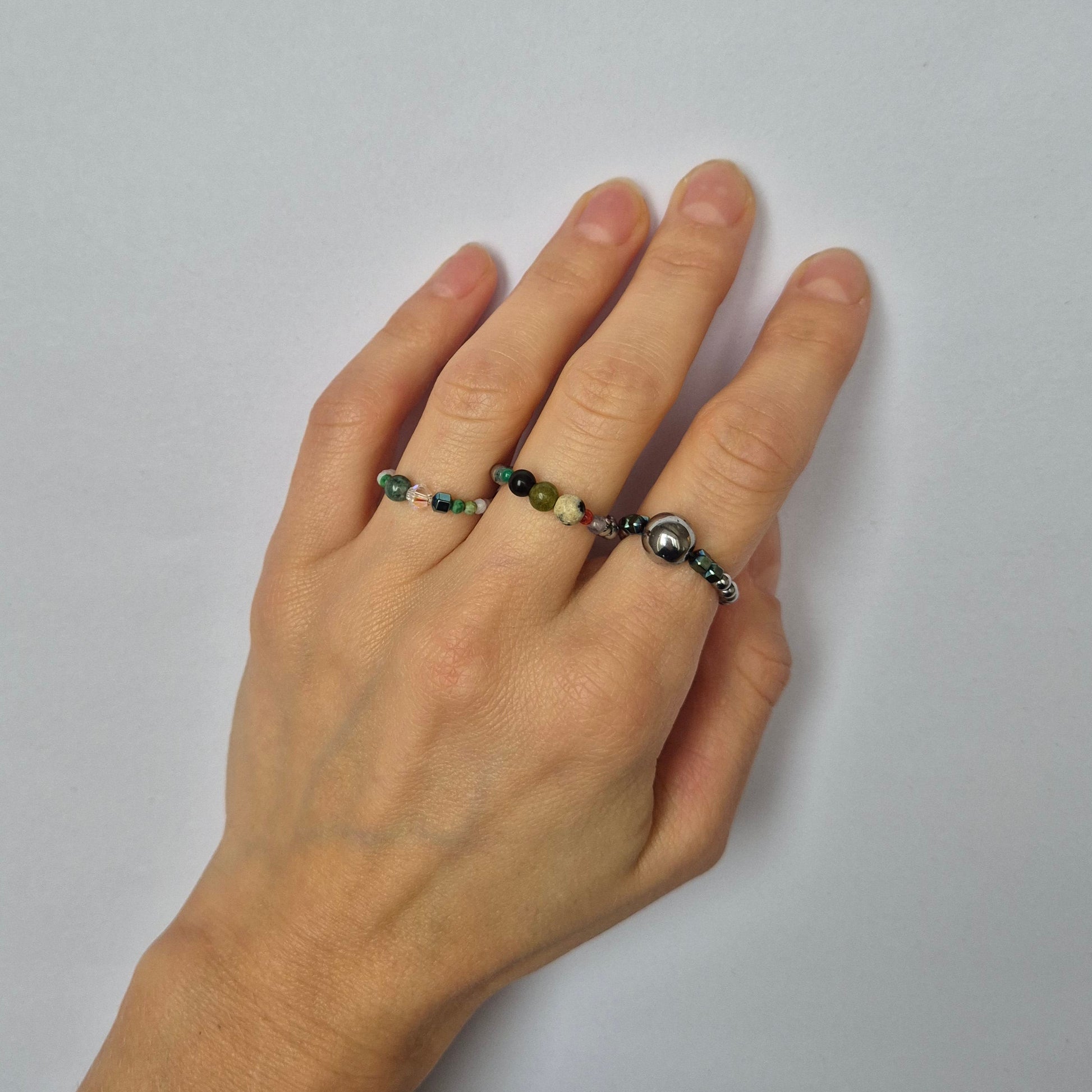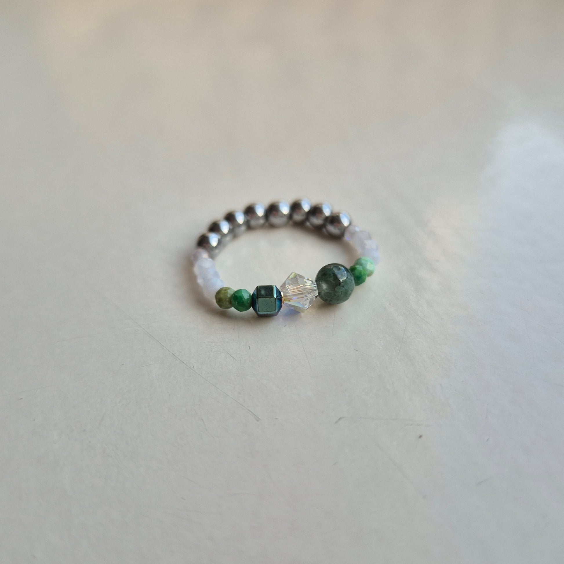 Pierścionek jest skonstruowany na gumce jubilerskiej, dzięki temu dostosowuje się do rozmiaru i kształtu palca.